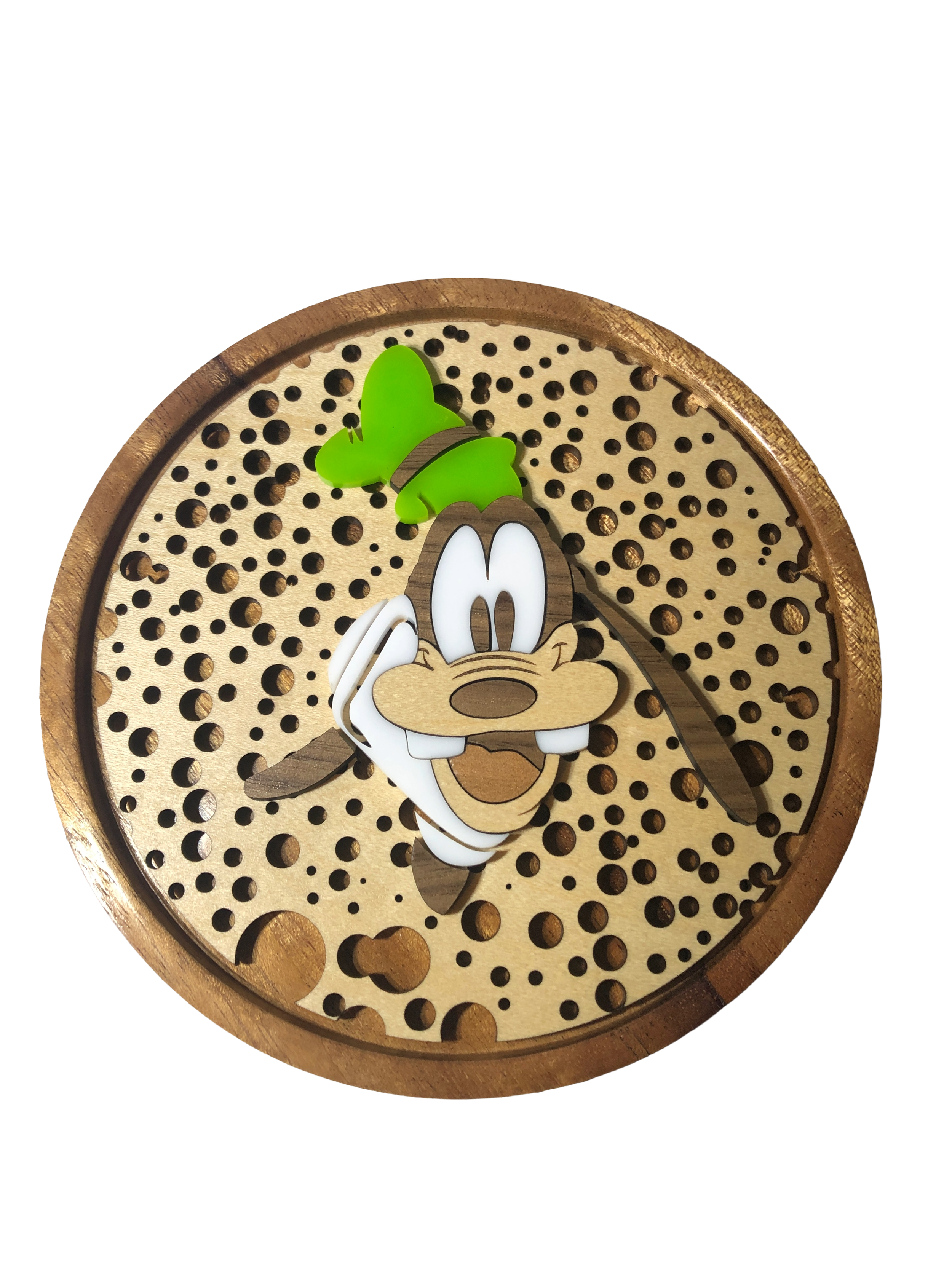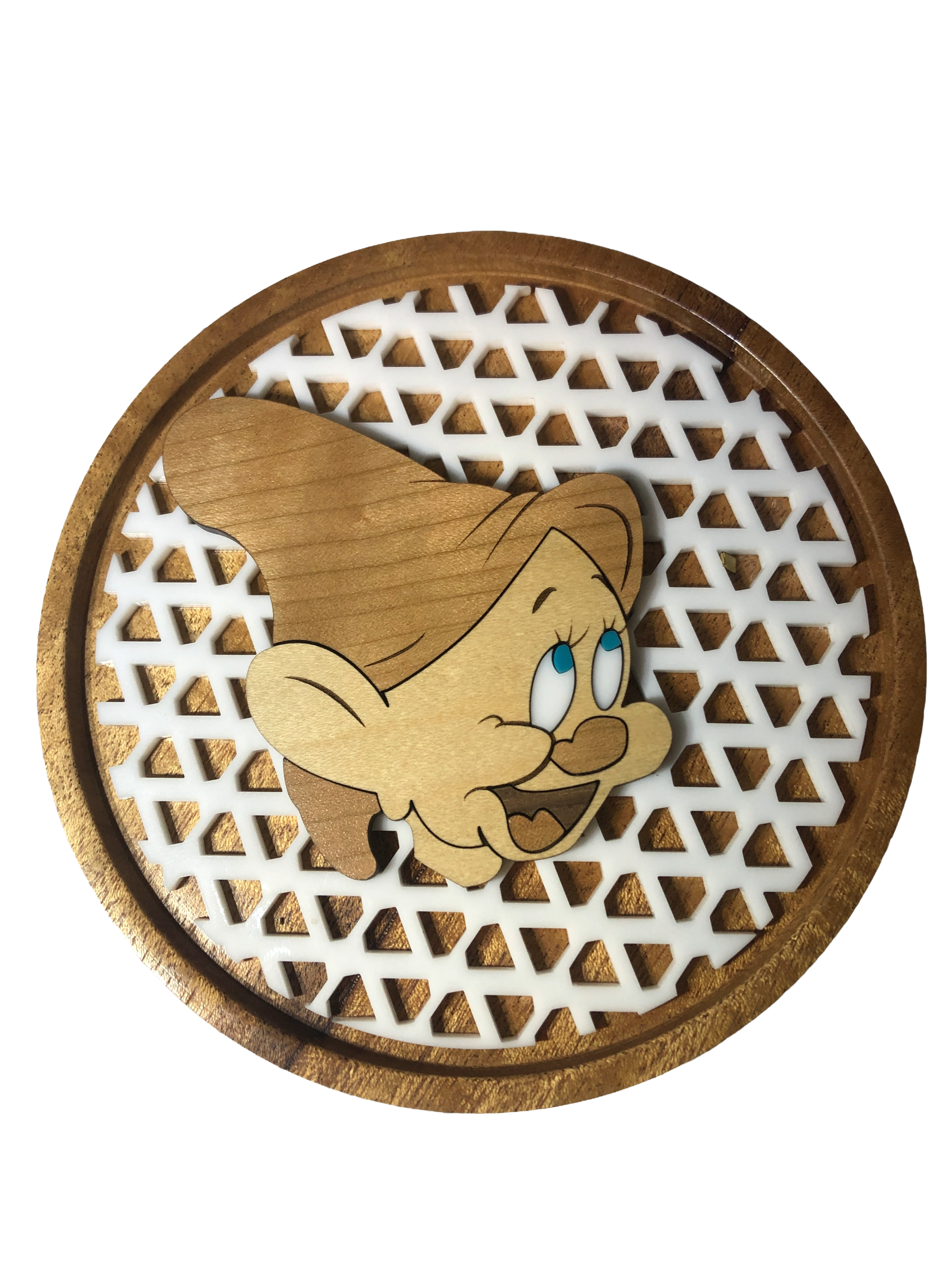 My client asked that I create special boxes for him and his husband that can hold odds and ends. After getting to know them, I realized that they each loved Disney. I asked what each of their favorite characters were and went from there. They feature the character that most embodies their individual personalities, Goofy for Greg and Dopey for Ed. They each feature subtle repeating backgrounds that relate to the characters—diamonds for Dopey, for example. They’re made from real mahogany and turned by hand on the lathe.